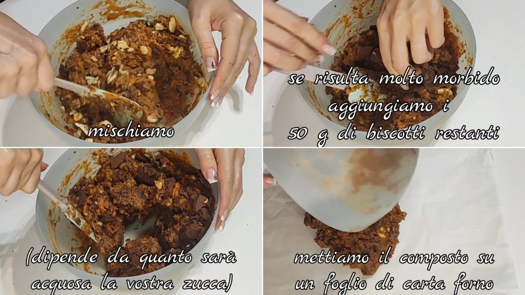 Mezclamos. Si la mezcla resulta demasiado blanda (depende de cuán acuosa esté vuestra calabaza) añadimos también los 50 g de galletas restantes. Ponemos la mezcla obtenida sobre una hoja de papel de horno.