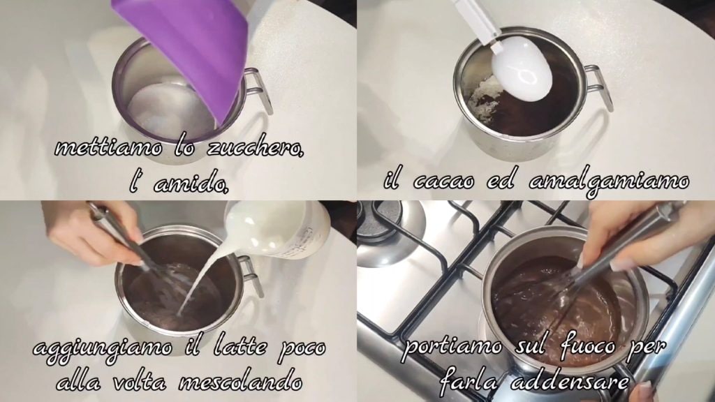 En un cazo ponemos el azúcar, el almidón, el cacao y mezclamos. Añadimos la leche poco a poco mezclando para evitar la formación de grumos. La llevamos al fuego para que espese.