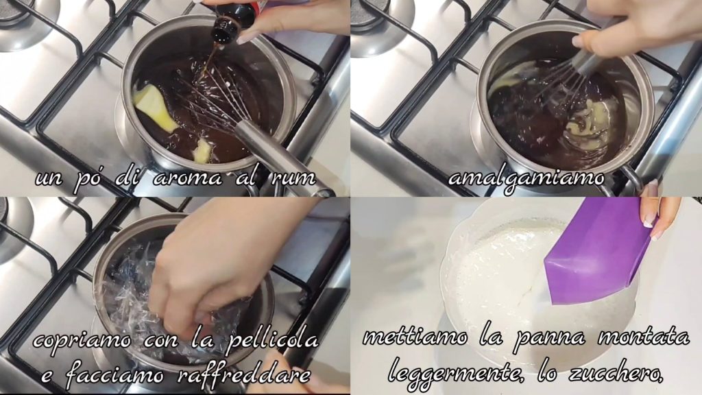 Añadimos un poco de aroma de ron. Mezclamos bien. Cubrimos con film transparente y dejamos enfriar.