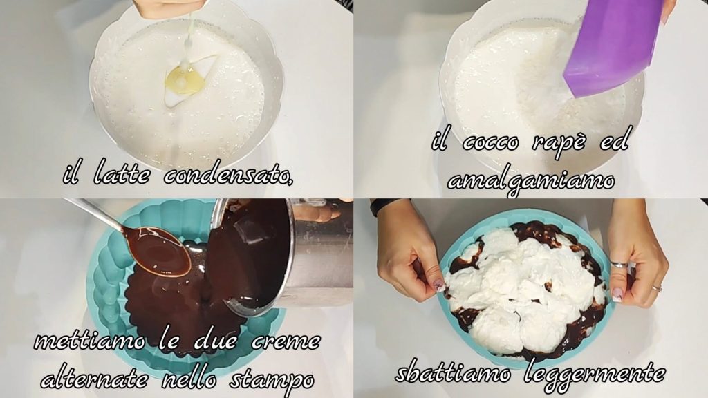 Ahora que ha llegado el buen tiempo, estamos buscando cosas frescas y lo menos complicadas posible para preparar. Te recomiendo este semifreddo que puedes preparar con mucha anticipación y conservarlo en el congelador hasta el momento de necesitarlo. ¡Es perfecto como postre al final de la comida o como merienda o refrigerio de la tarde! He elegido combinar el coco y el chocolate que, según yo, son dos sabores que se complementan perfectamente!