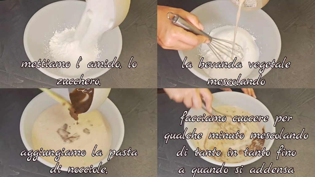 Mezclamos el almidón con la bebida de avellanas y llevamos al fuego para que espese. Añadimos la crema de avellanas. Seguimos mezclando.