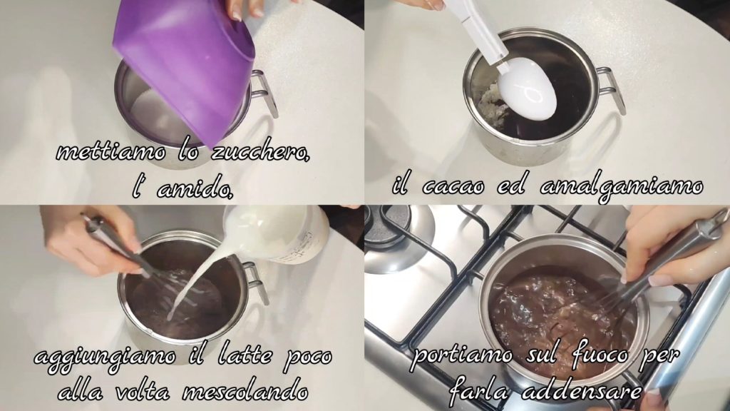 En una cacerola, ponemos el azúcar, el almidón, el cacao y mezclamos. Añadimos la leche poco a poco mientras removemos. Llevamos al fuego para que espese.