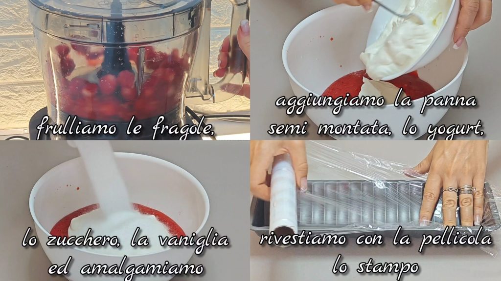 Primero debemos lavar, limpiar y triturar las fresas. Las ponemos en un bol luego añadimos la nata semi montada, el yogur, el azúcar, la vainilla y mezclamos. Cubrimos con film un molde de la forma deseada