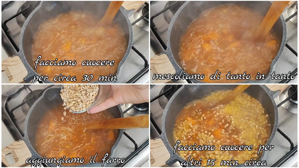Cocemos durante unos 30 minutos removiendo de vez en cuando. Añadimos la espelta y cocemos durante otros 15 minutos aproximadamente.