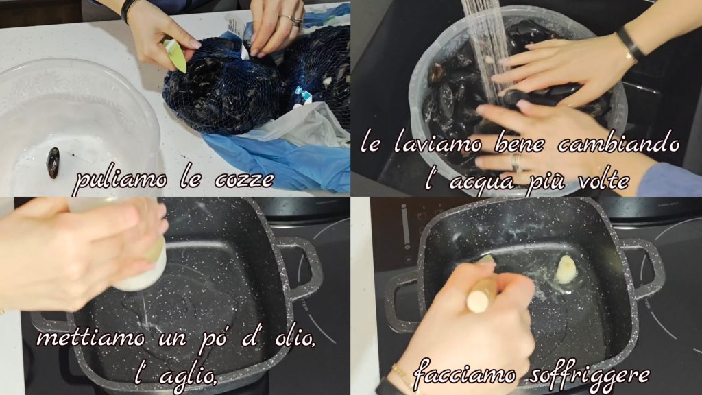 Primero, debemos ocuparnos de la limpieza de los mejillones, los lavamos cuidadosamente cambiando el agua varias veces, limpiamos y lavamos también las gambas. En una cacerola ponemos un poco de aceite, ajo y sofreímos.