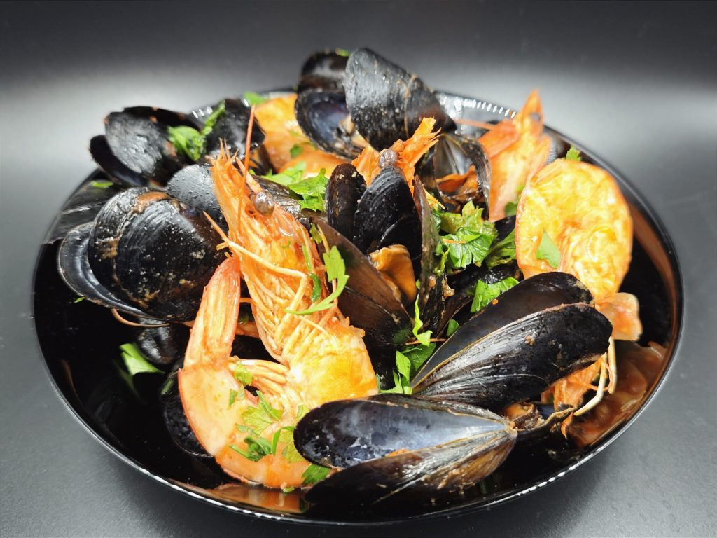 Una opita deliciosa para incluir en nuestro menú de pescado hecha con gambas y mejillones, un clásico sofrito de ajo y aceite, salsa de tomate, vino blanco y especias al gusto. Personalmente, me gusta mucho este plato, especialmente como entrante. En lugar de hacer el clásico Salteado de mejillones prefiero esta sopa acompañada de costrones o bruschetas!
