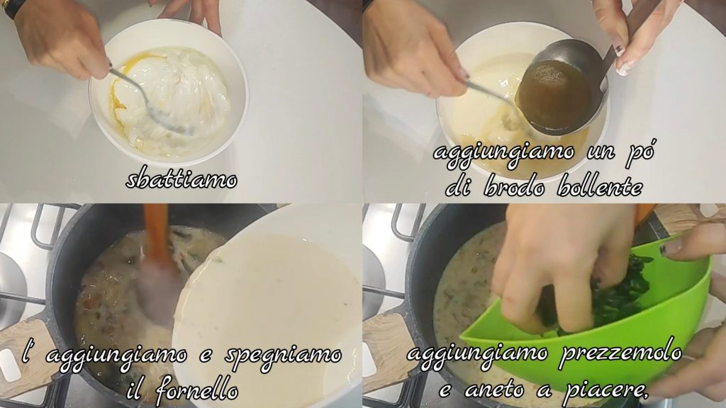 batimos. Añadimos un poco de caldo caliente y luego lo añadimos a la sopa. Apagamos el fuego y añadimos el eneldo y perejil picado al gusto.