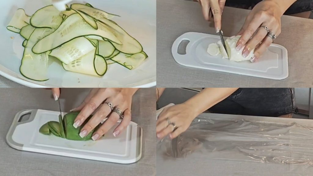 Primero debemos lavar cuidadosamente el pepino y cortarlo en rodajas muy finas (te recomiendo usar una mandolina). Cortamos la mozzarella en rodajas finas, limpiamos y cortamos en rodajas finas también el aguacate. Ponemos film plástico en la superficie de trabajo.