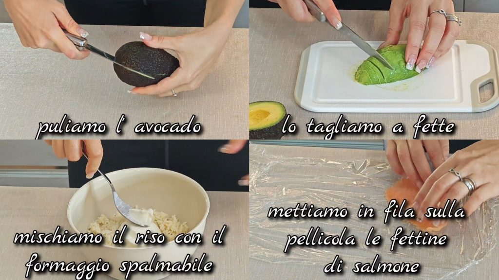 Primero limpiamos el aguacate y lo cortamos en rodajas finas. Mezclamos el arroz cocido y enfriado con el queso para untar. Colocamos las lonchas de salmón ahumado en fila sobre el film alimenticio.