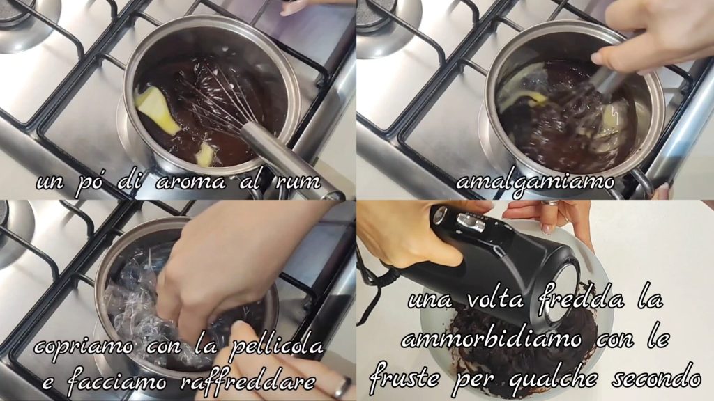 Ponemos un poco de aroma de ron y mezclamos. Cubrimos con film y dejamos enfriar. Una vez fría, la suavizamos con las varillas durante unos minutos.