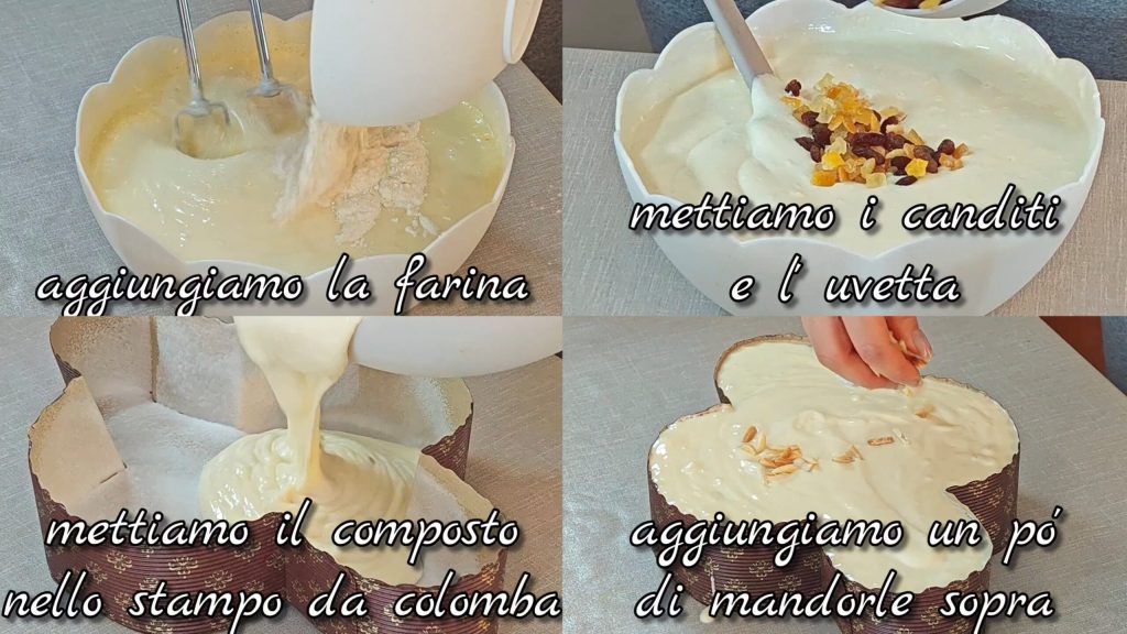 • Por último, añadimos la harina y mezclamos. Agregamos las frutas confitadas a gusto y las pasas. Ponemos la mezcla obtenida en el molde de colomba de 1 kg. Añadimos un poco de almendras encima