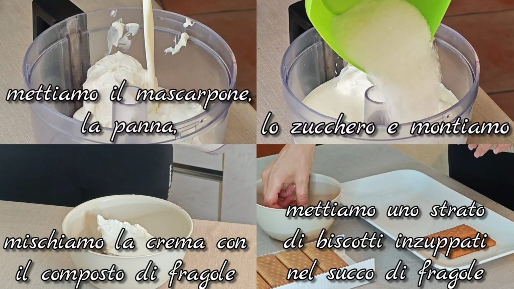 Ponemos el mascarpone, la nata y el azúcar y montamos. Mezclamos la crema obtenida con el compuesto de fresas preparado anteriormente.