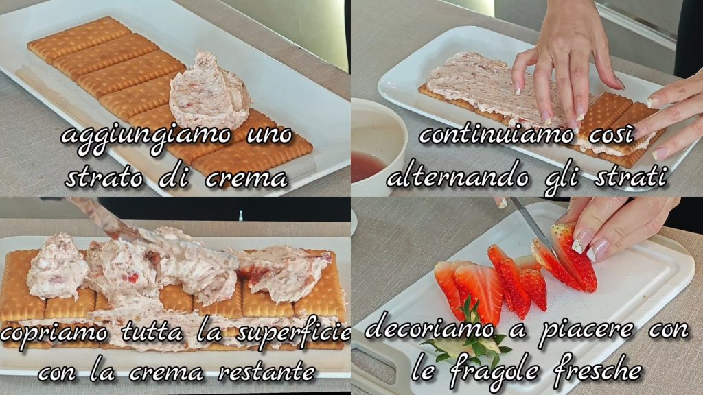 Una tarta deliciosa, fresca, hecha sin horno en poquísimo tiempo. ¡Si te gustan las fresas, te recomiendo probar esta tarta sin falta! Es el postre perfecto para llevar si te han invitado a cenar o si tienes invitados, es el postre perfecto también para Pascua y Lunes de Pascua. He optado por hacer la base de esta tarta con galletas para que pueda ser disfrutada también por aquellos que son intolerantes o por varios motivos no pueden comer huevos.