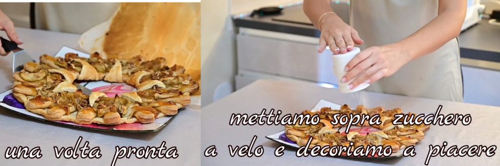 Quitamos el recipiente y cortamos en porciones el centro del hojaldre. Elevamos las puntas. Pincelamos con un poco de mermelada mezclada con un poco de agua y cocinamos a 180° durante unos 20/30 min.