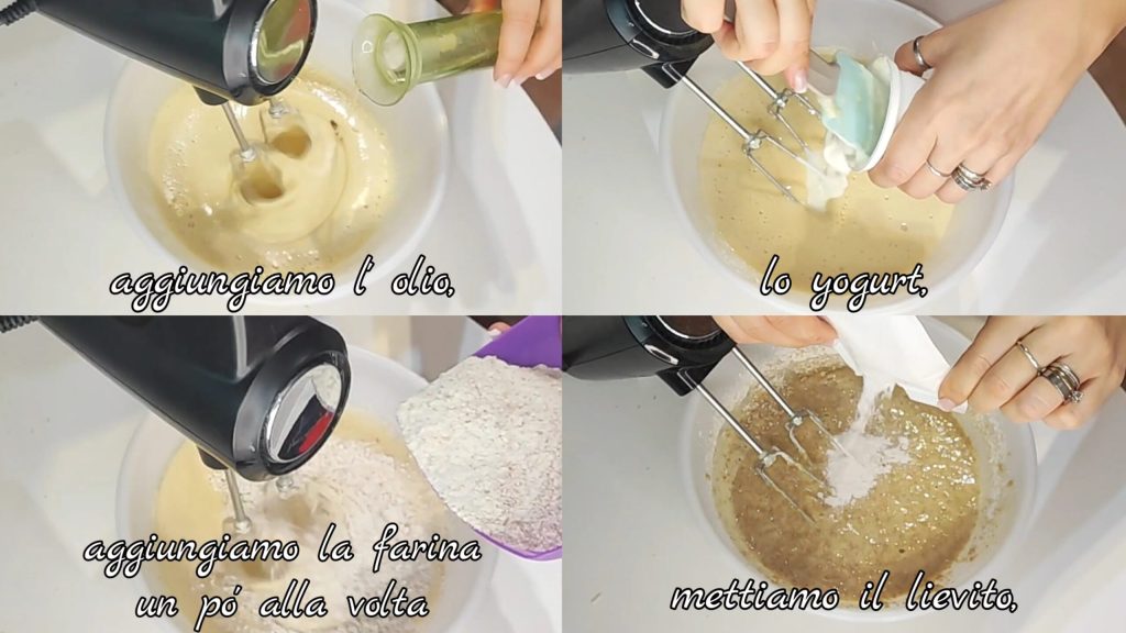 Añadimos el aceite, el yogur y la harina poco a poco mezclando. Finalmente añadimos la levadura.