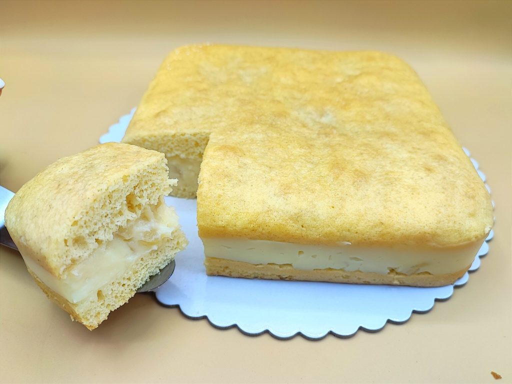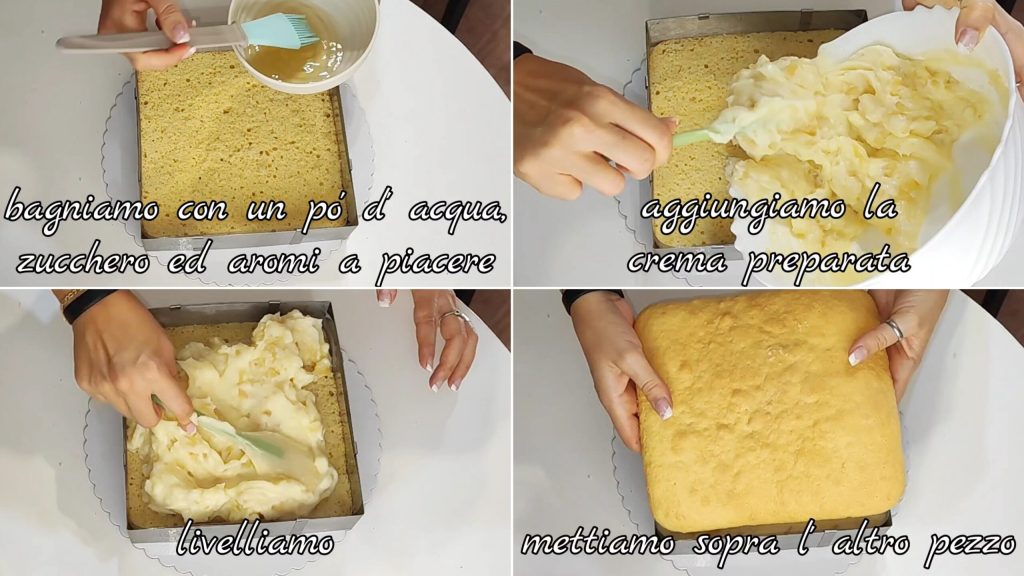 Humedecemos ligeramente con un poco de agua con azúcar y aromas al gusto. Añadimos la crema preparada, nivelamos y luego ponemos encima el otro trozo de la base.