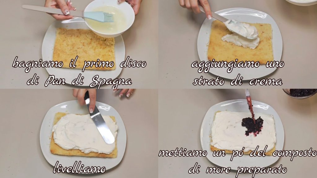 empapamos el primer disco de bizcocho. Añadimos una capa de crema y nivelamos. Ponemos encima un poco del compuesto de moras preparado.