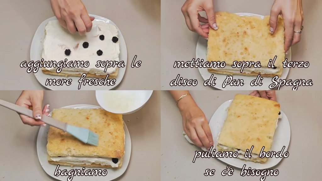 Ponemos encima las moras frescas. Añadimos el tercer disco de bizcocho, empapamos. Limpiamos el borde del plato si es necesario.