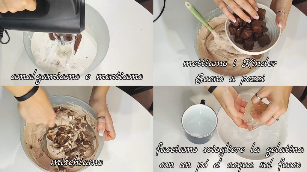mezclar y montar con las varillas. Al final agregamos los Kinder Bueno en trozos y mezclamos. Derretimos la gelatina bien escurrida en el fuego con un poco de agua