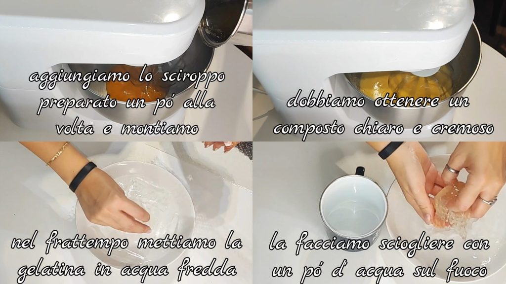 Añadimos el jarabe preparado poco a poco sobre las yemas y batimos. Debemos obtener una mezcla clara y cremosa. Mientras tanto, ponemos la gelatina a remojar en agua fría luego la hacemos disolver al fuego con un poco de agua.