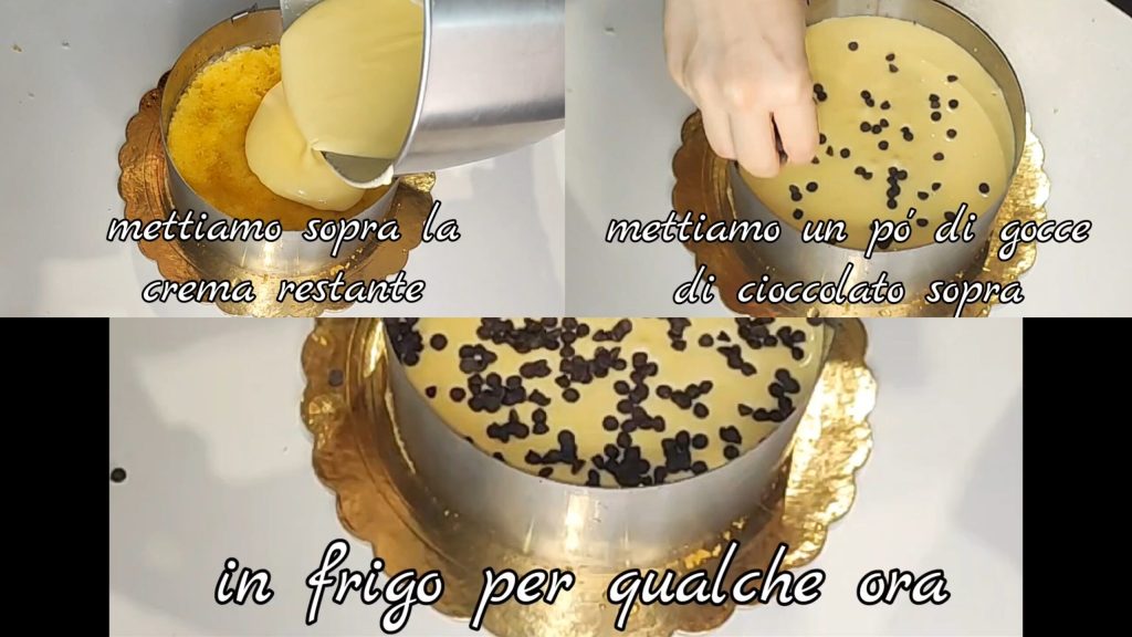 Ponemos encima el segundo disco de bizcocho, lo bañamos y cubrimos con la mitad de la crema restante. Ponemos encima gotas de chocolate al gusto. Al frigorífico por algunas horas.