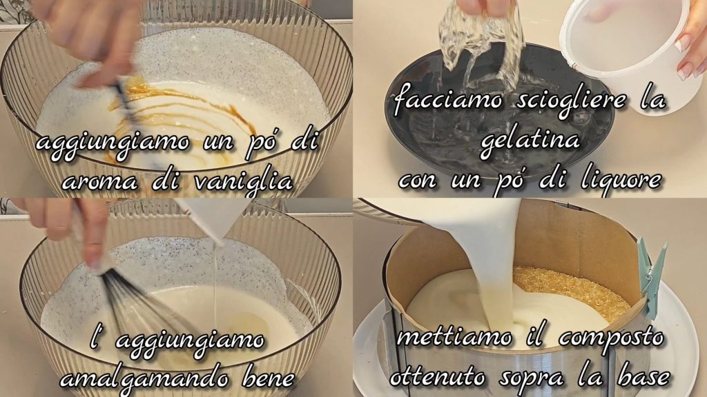 Añadimos aroma de vainilla y mezclamos. Derretimos la gelatina previamente hidratada con un poco de licor y la agregamos a la mezcla removiendo. Ponemos la mezcla obtenida sobre la base de galletas.