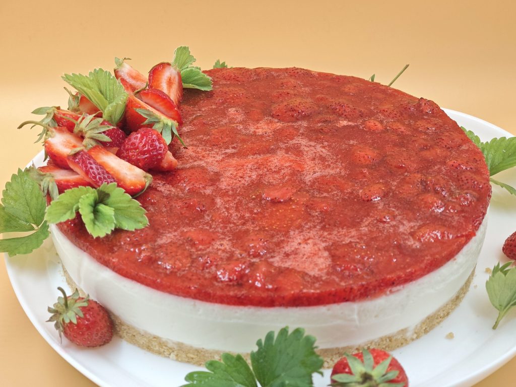 Una tarta deliciosa, muy fresca hecha sin cocción con ingredientes sencillos como el yogur, la nata y las fresas. ¡Esta tarta es el postre perfecto al final de una comida o como merienda por la tarde, se puede llevar a amigos y familiares, en fin, es perfecta en cualquier momento!