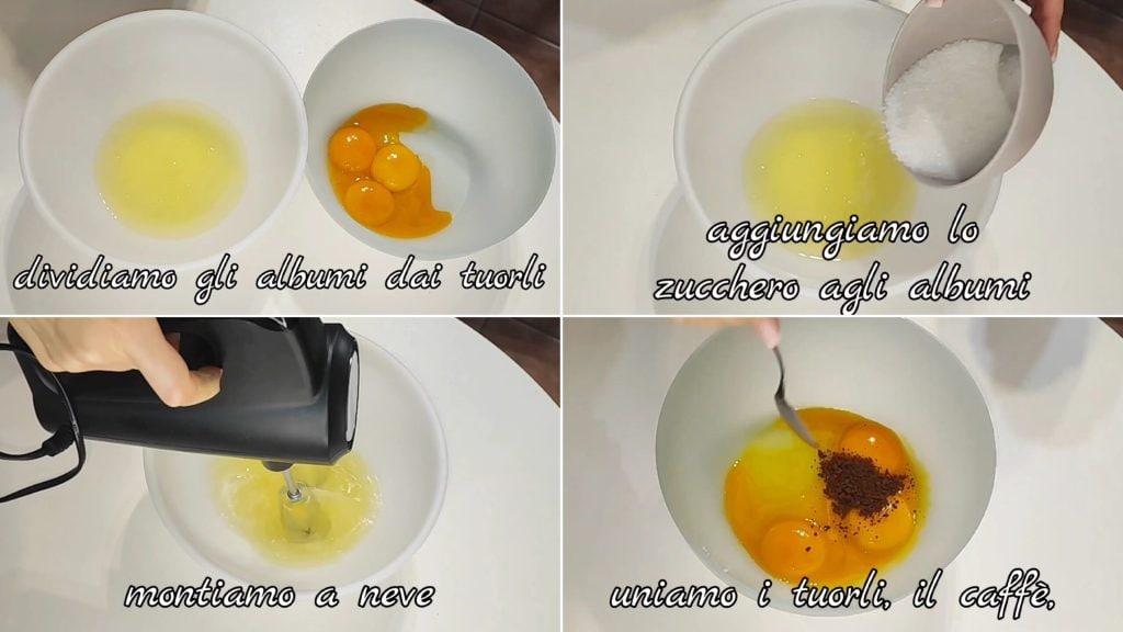 Preparación de la base: Primero debemos separar las claras y las yemas. Juntamos las claras y el azúcar, luego montamos a punto de nieve. Añadimos las yemas, el café soluble.