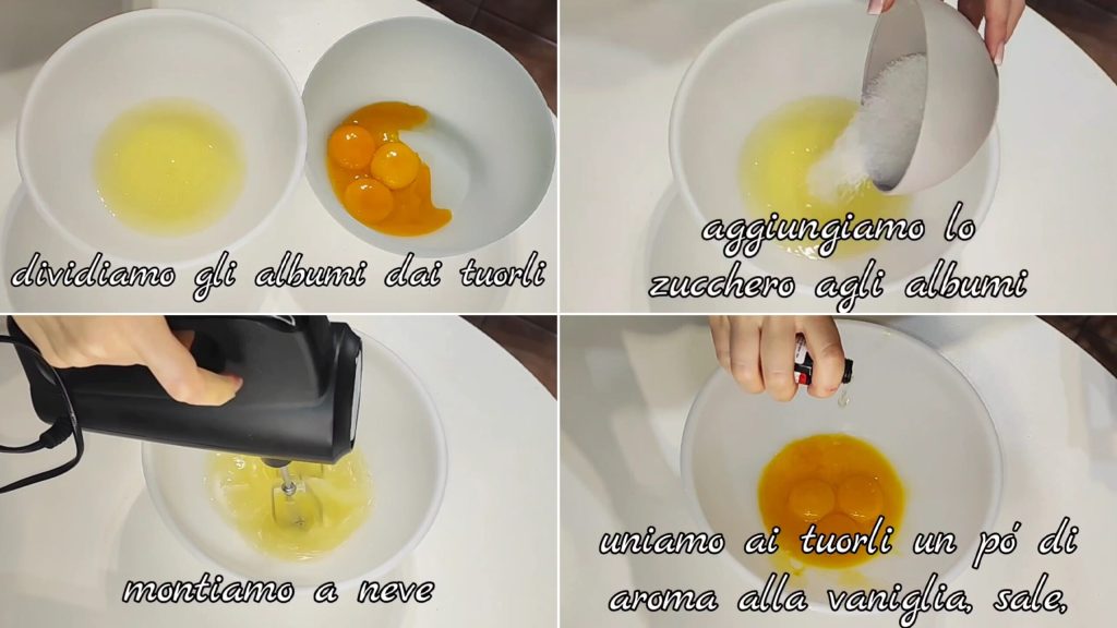 Primero, separamos las claras de las yemas. Añadimos el azúcar a las claras y batimos a punto de nieve. Añadimos a las yemas un poco de aroma de vainilla y sal.