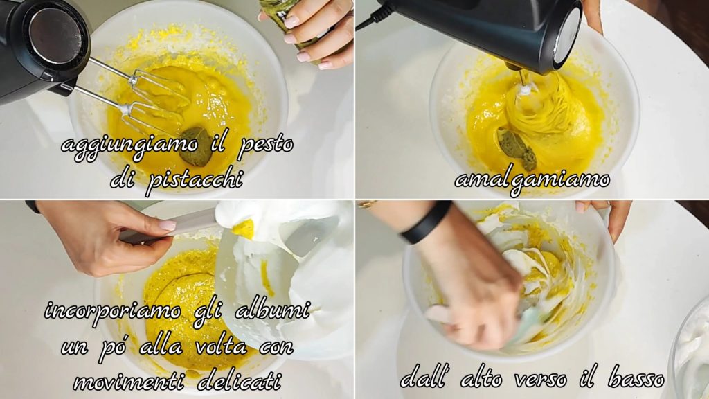 Agregamos el pesto de pistachos y mezclamos bien. Incorporamos las claras montadas poco a poco con movimientos delicados de arriba hacia abajo.