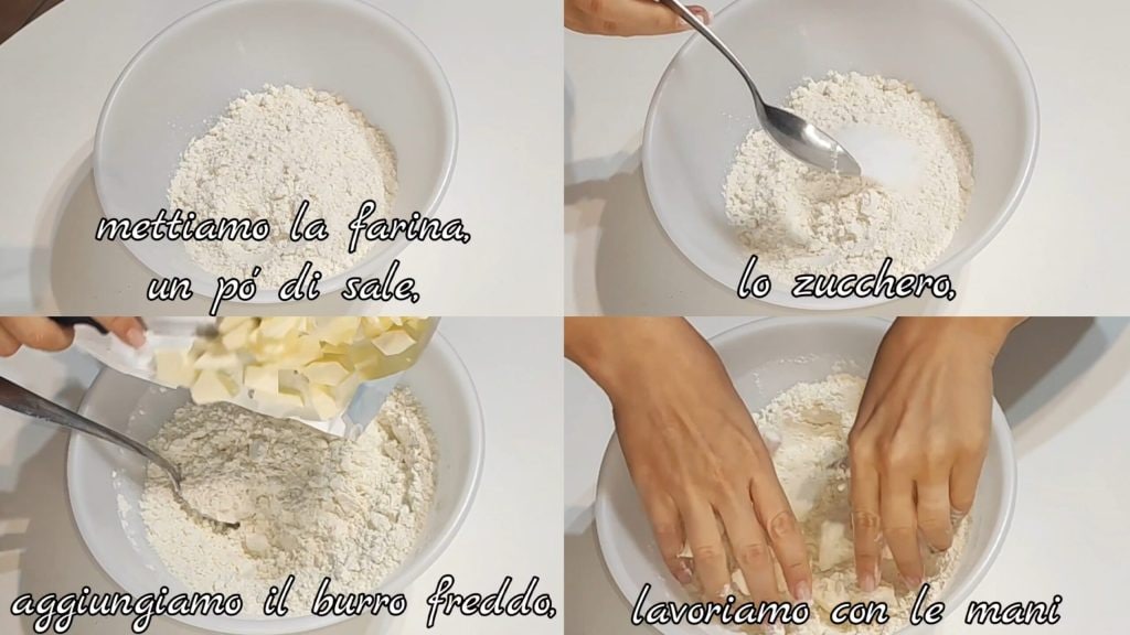 En un recipiente ponemos la harina, una pizca de sal, el azúcar, la mantequilla fría y trabajamos con las manos.