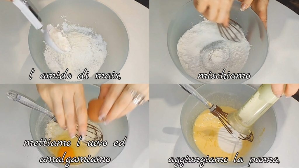 el almidón de maíz, mezclamos. Añadimos el huevo y mezclamos. Ponemos la nata líquida (50 ml),