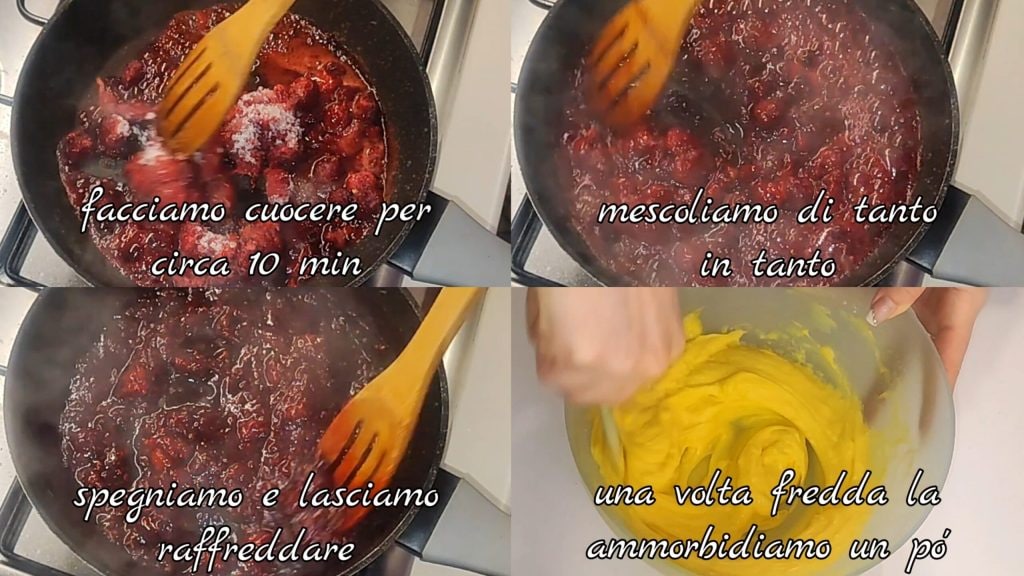 cocinamos durante unos 10 min, removiendo de vez en cuando. Apagamos y dejamos enfriar. Tomamos la crema fría, la ablandamos un poco.