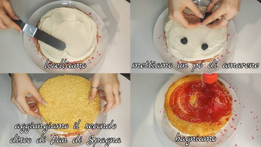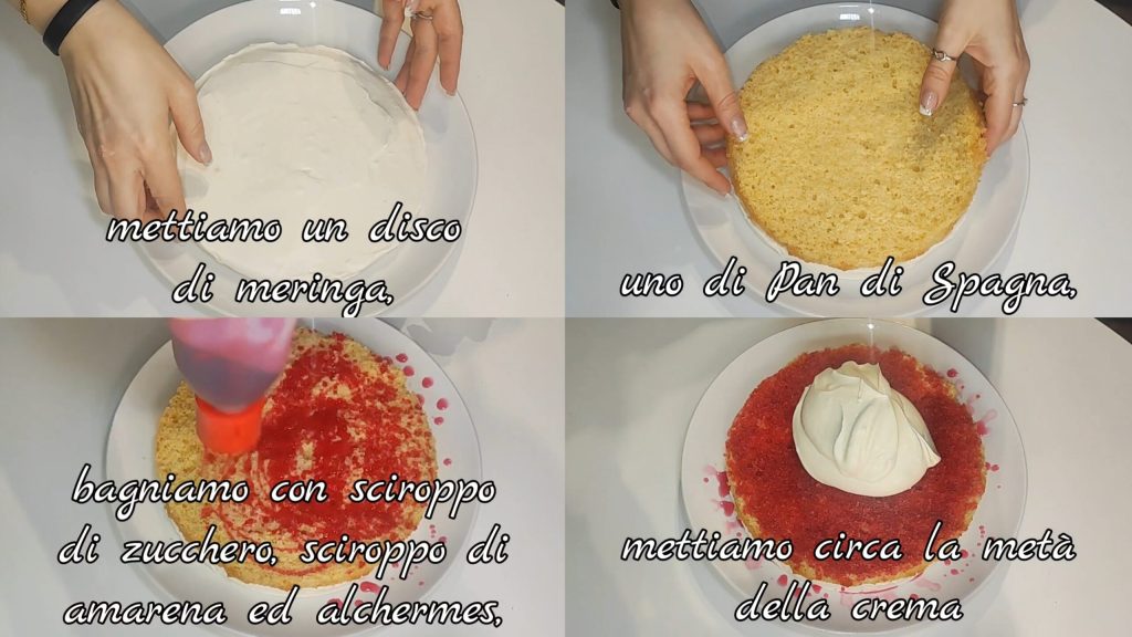 Ponemos un disco de merengue, un disco de Pan de España, bañamos con una mezcla de jarabe de azúcar, alchermes y jarabe de guindas. Ponemos una capa de crema (aproximadamente la mitad).