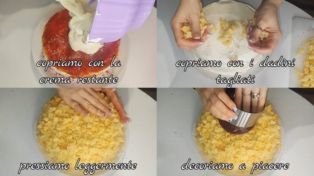 cubrimos con la crema restante. Añadimos los daditos cortados previamente, presionamos ligeramente luego decoramos a placer. En la nevera por unas horas.