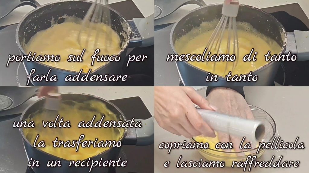 ponemos al fuego para que espese mientras mezclamos de vez en cuando. Una vez espesa la transferimos a un recipiente, cubrimos con film y dejamos enfriar.