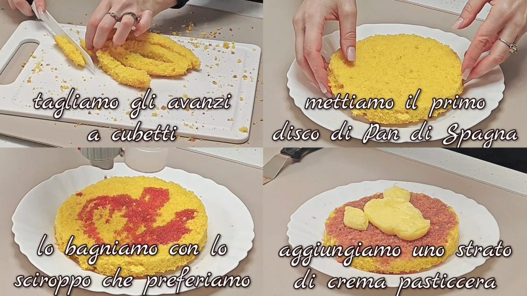 Cortamos en cubitos los restos de bizcocho. Ponemos el primer disco de bizcocho, lo mojamos. Añadimos una capa de crema pastelera.