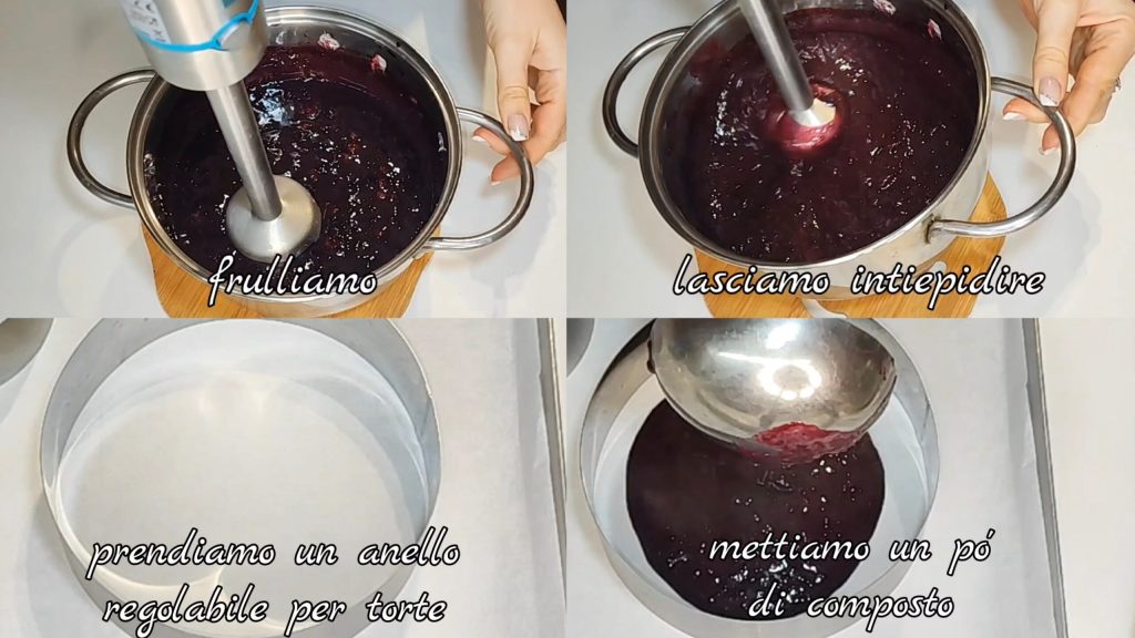 trituramos con una batidora de inmersión. Dejamos templar. Ponemos un poco de la mezcla en un disco sobre papel de horno y dejamos enfriar.