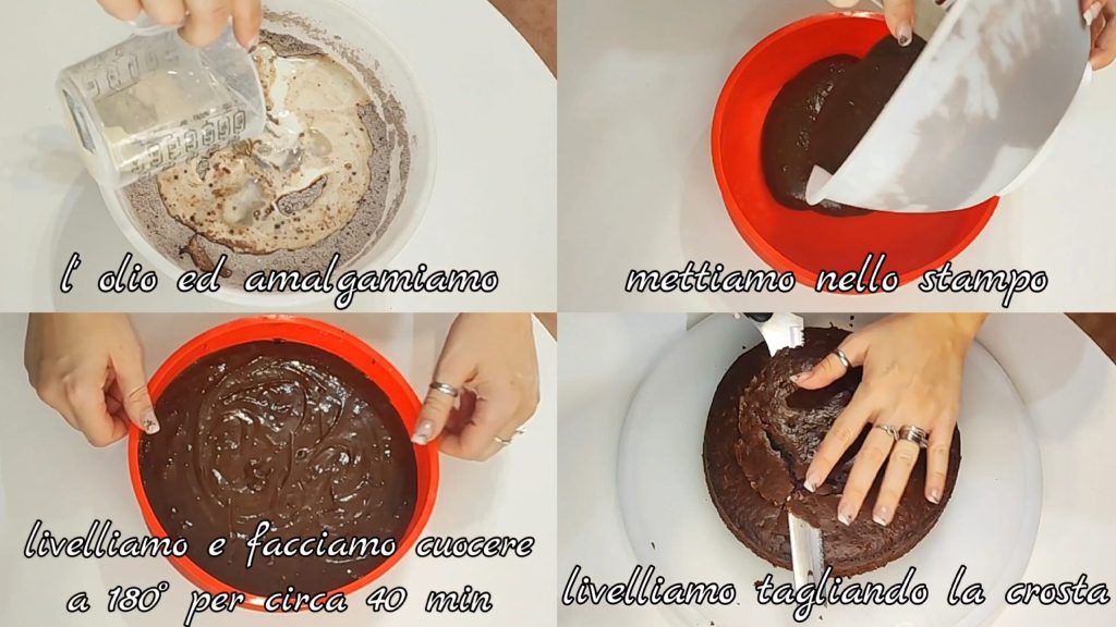 Añadimos el aceite y mezclamos. Ponemos en el molde. Nivelamos y horneamos a 180° por unos 40 min. Una vez cocida y bien enfriada, la nivelamos cortando la corteza.