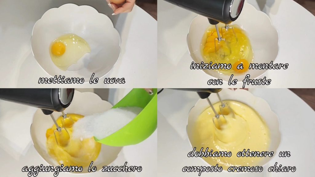 En un recipiente ponemos los huevos y comenzamos a trabajar con las varillas, añadimos el azúcar y seguimos batiendo.