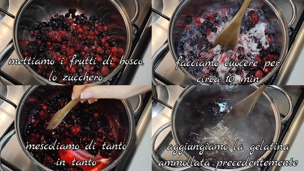 En una cacerola ponemos los frutos del bosque, el azúcar y cocinamos durante unos 10 min, removiendo de vez en cuando. Al final añadimos la gelatina remojada previamente en agua fría.