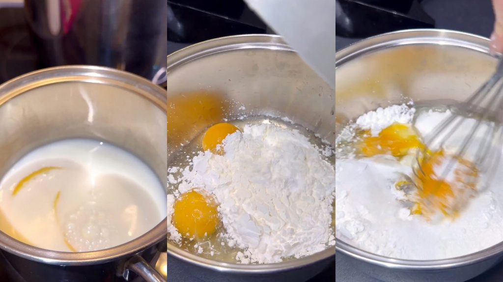 En un cazo pon los huevos, el azúcar y la maicena y mezcla bien.