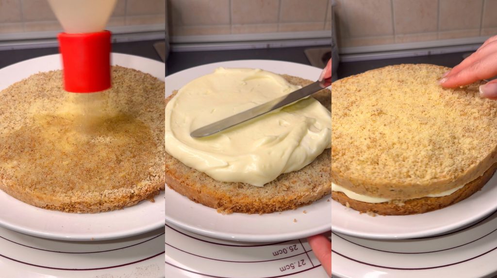 Mójalo y cubre toda la tarta con la crema restante, incluidos los bordes.