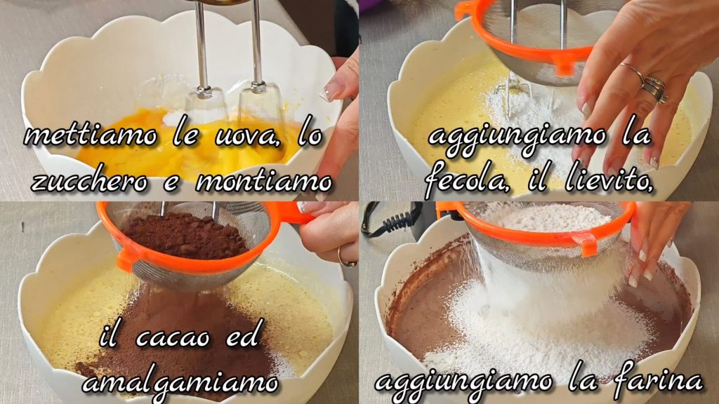 Batimos los huevos con el azúcar. Añadimos la fécula, la levadura, el cacao y mezclamos. Añadimos la harina.