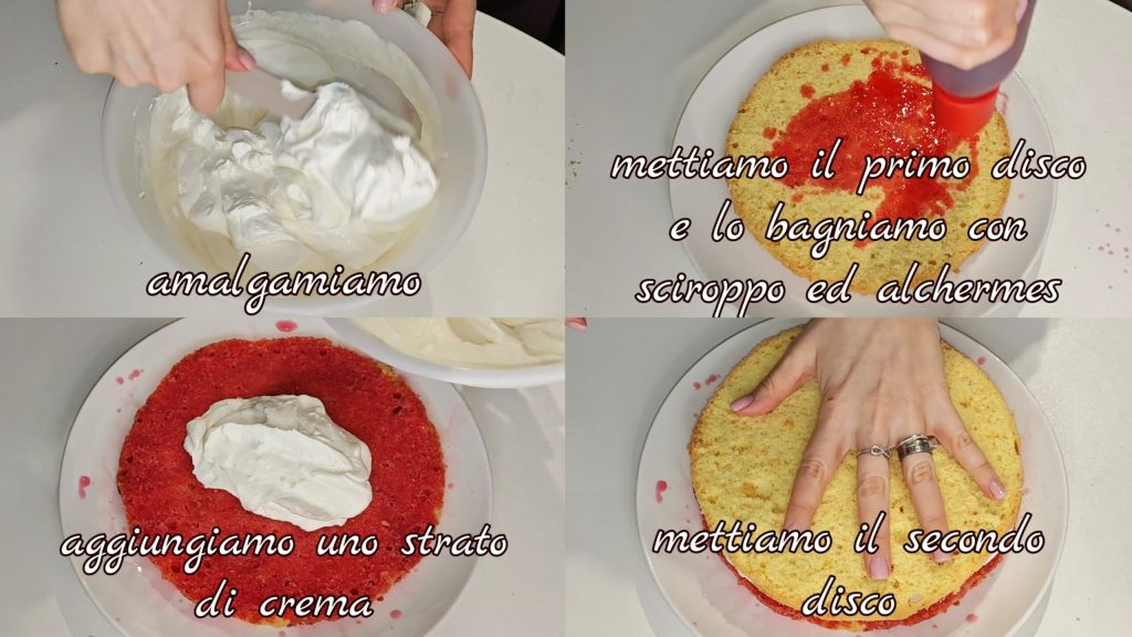 Ponemos el primer disco y lo bañamos con jarabe y alchermes. Añadimos una capa de crema y nivelamos. Ponemos el segundo disco.