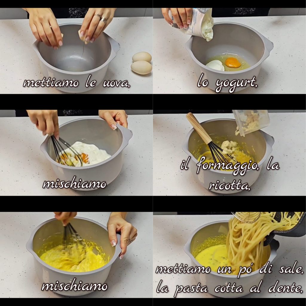 En un recipiente ponemos los huevos, el yogur y mezclamos. Añadimos el queso, la ricotta, sal y la pasta (mientras tanto cocida al dente y escurrida),
