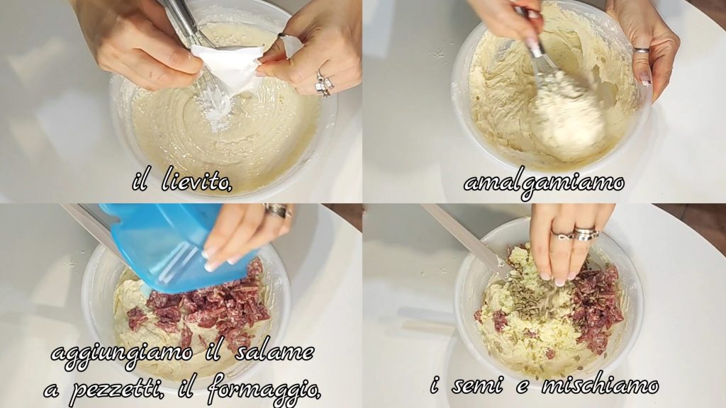 Ponemos la levadura y mezclamos. Al final, añadimos el salami y el queso cortados en pequeños cubos y las semillas (opcional) y luego mezclamos bien todo.