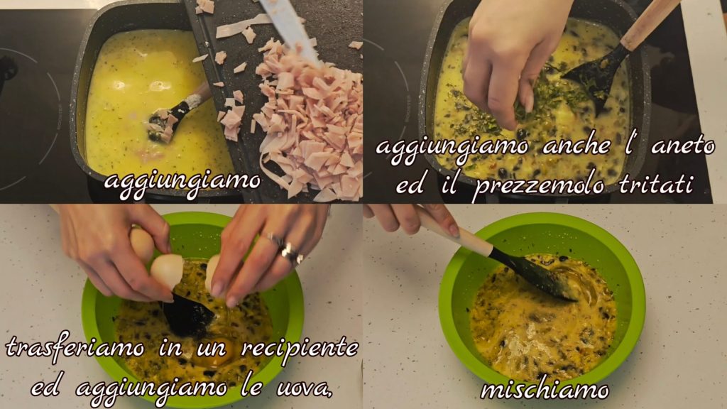 las añadimos. Añadimos también el eneldo y el perejil picados. Transferimos a un recipiente y añadimos los huevos.