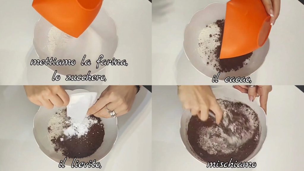 En un recipiente ponemos la harina, el cacao, el azúcar, la levadura y mezclamos.