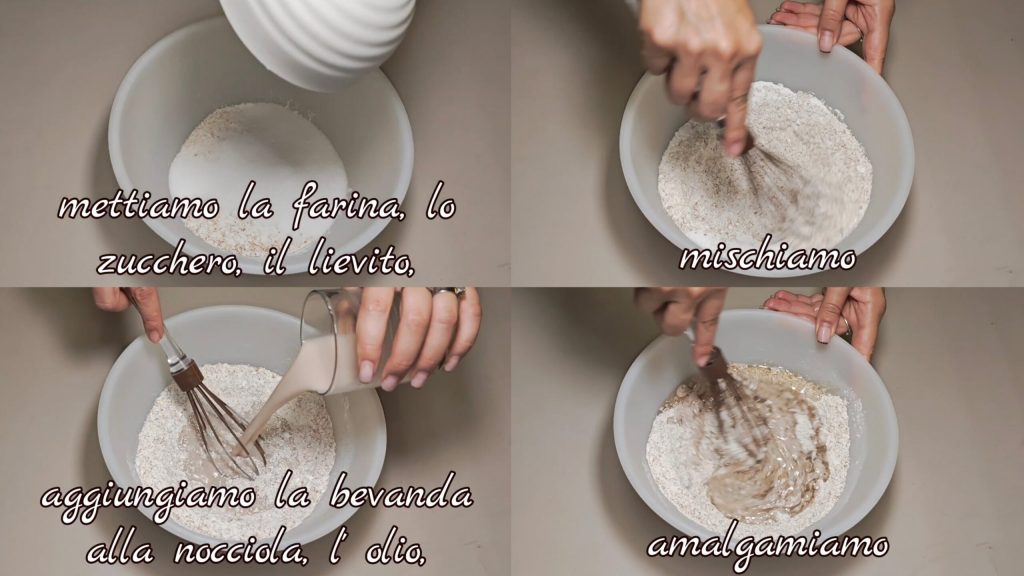 En un recipiente ponemos la harina, el azúcar, la levadura y mezclamos. Añadimos la bebida de avellanas, el aceite y lo mezclamos todo.